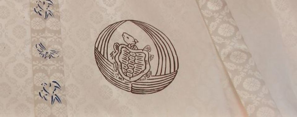 御神紋の蓑亀は、和同8年(西暦715年)大干ばつの折、農民が雨乞い祈願をしたところ里中の洞穴から左目白く首赤く背三に分れ七星の紋がある霊亀が這い出て、大雨が降り農作物が蘇生したことから、古来より長寿の象徴とされ、縁起の良いめでたい動物である亀が神紋とされた。その洞穴あたりを大亀川・狼川・老上川(現在の大津市と草津市の川付近か)と言う。