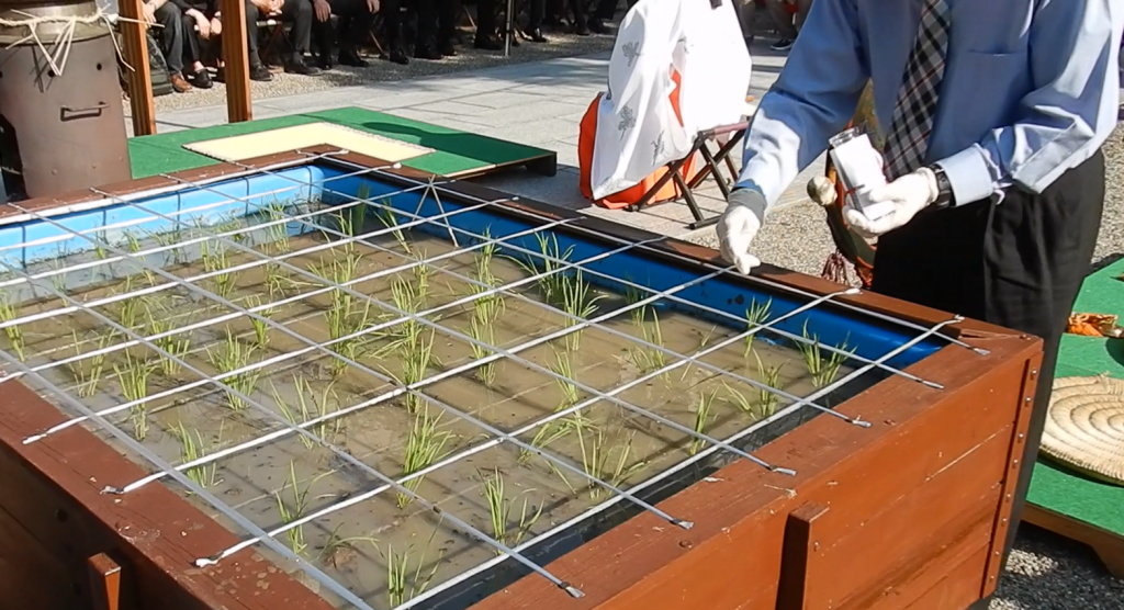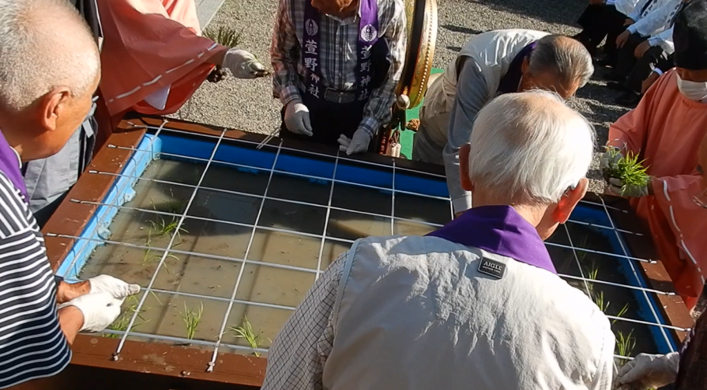 今年 米寿を迎えられた8名の方に、男性は「田男」、女性は「早乙女」として「御田植えの儀」に参列していただき苗を植えていただきました。